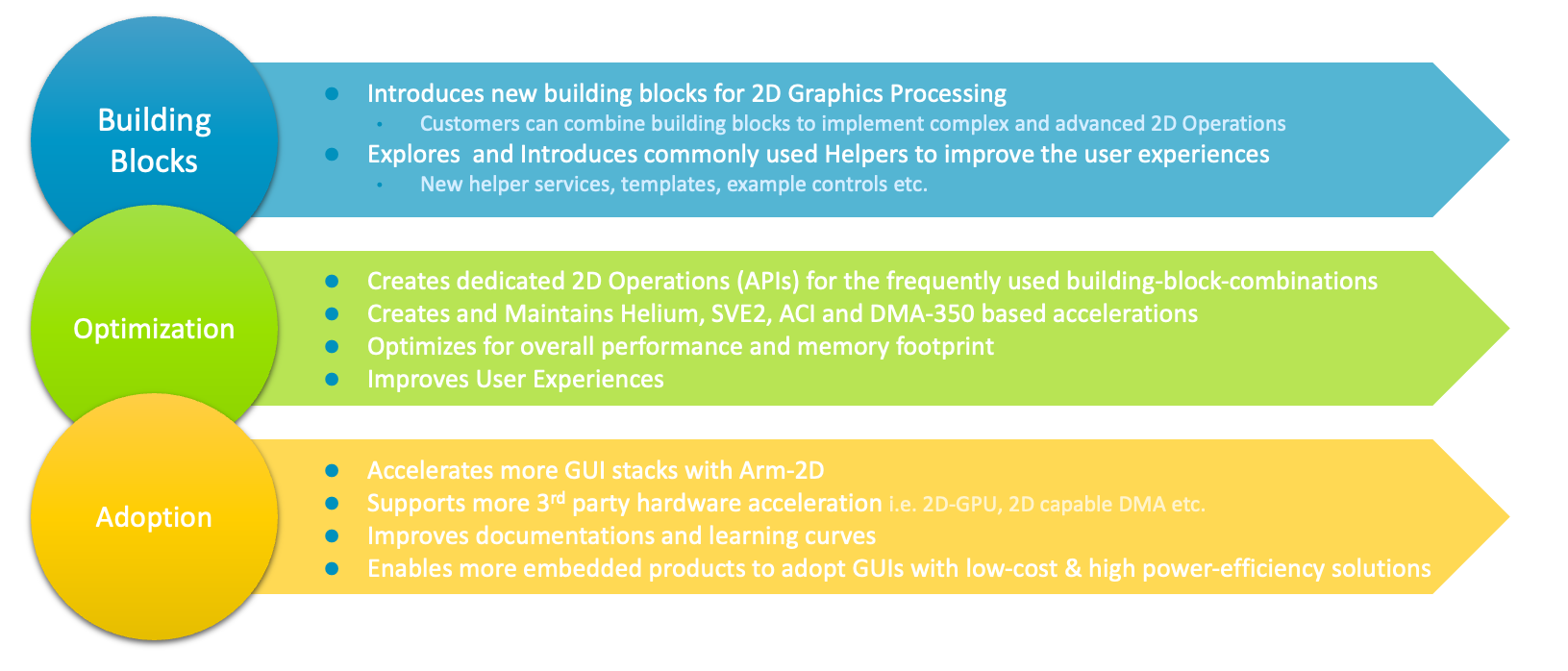 - Silicon vendors can provide drivers to further accelerate Arm-2D in order to take advantage of the proprietary hardware accelerators for their customers.