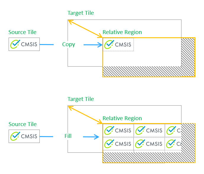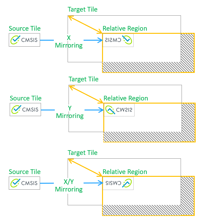 The behaviour of function arm_2d_rgb16_tile_copy is illustrated in Figure 4.4. This function copies a source tile to a specified region inside the target tile or fills the specified region with a given source tile. Several combinations of modes are supported, e.g. copy with X mirroring and/or Y mirroring.