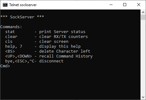 The SockServer is an application providing a set of services used by the WiFi CMSIS-Driver Validation suite to test the Socket interface of the WiFi driver. It is located in the .\Tools\SockServer subdirectory of the pack root directory. The SockServer is available for different target systems. It runs several standard network services.