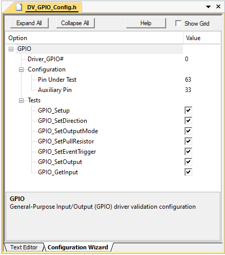 The GPIO driver validation settings are available in the DV_GPIO_Config.h configuration file.