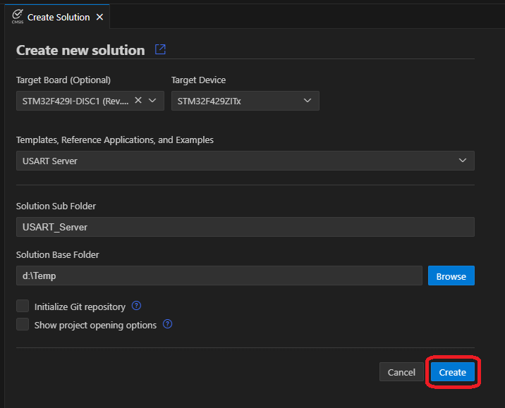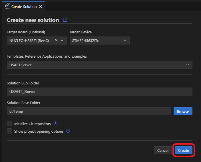 - In the CMSIS extension, click Create a New Solution.