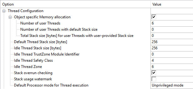 | Idle Thread TrustZone Module ID | OS_IDLE_THREAD_TZ_MOD_ID | Defines the TrustZone Module ID the Idle Thread shall use. This needs to be set to a non-zero value if the Idle Thread need to call secure functions. Default value is 0. |