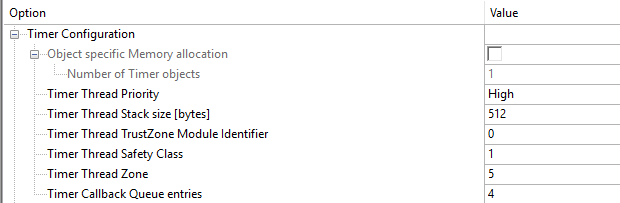 | Timer Thread TrustZone Module ID | OS_TIMER_THREAD_TZ_MOD_ID | Defines the TrustZone Module ID the Timer Thread shall use. This needs to be set to a non-zero value if any Timer Callbacks need to call secure functions. Default value is 0. |