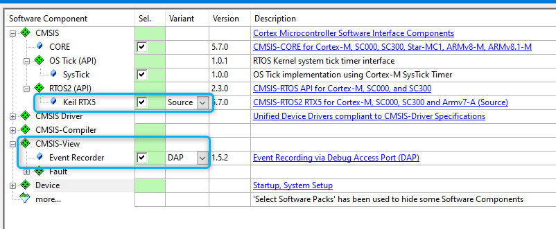 - In the Manage Run-Time Environment window, select CMSIS::CORE, CMSIS::OS Tick (API)::SysTick and CMSIS::RTOS2 (API)::Keil RTX5. You can choose to either add RTX as a library (Variant: Library) or to add the full source code (Variant: Source) - required if using the Event Recorder: