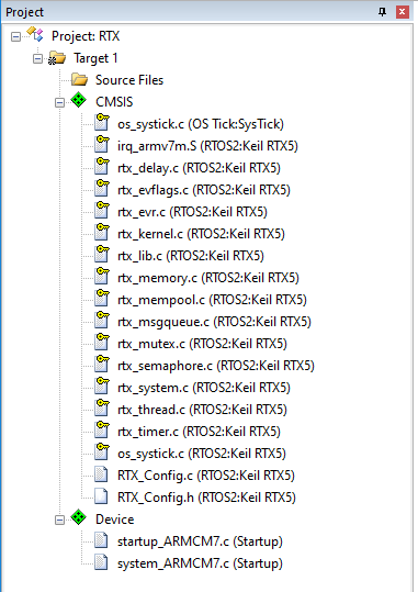 - Click OK. In the Project window, you will see the files that have been automatically added to you project, such as RTX_Config.h, RTX_Config.c, the library or the source code files, as well as the system and startup files: