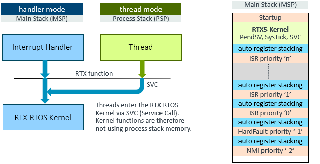 Keil RTX v5 kernel functions are executed in handler mode (using PendSV/SysTick/SVC) and the table below lists the maximum stack requirements for the Main Stack (MSP) that the user should consider.