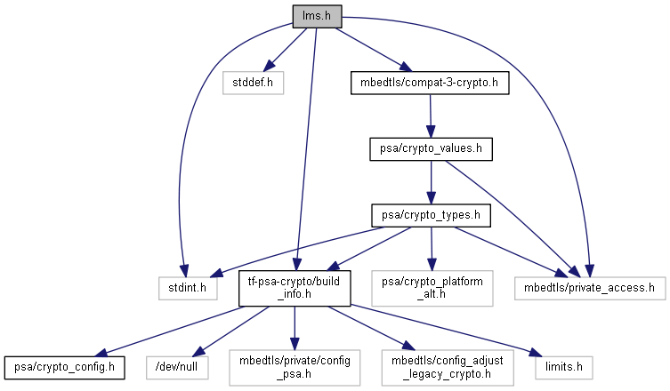 This file provides an API for the LMS post-quantum-safe stateful-hash public-key signature scheme as defined in RFC8554 and NIST.SP.200-208. This implementation currently only supports a single parameter set MBEDTLS_LMS_SHA256_M32_H10 in order to reduce complexity. This is one of the signature schemes recommended by the IETF draft SUIT standard for IOT firmware upgrades (RFC9019).