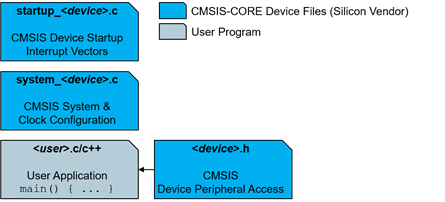 To use the CMSIS-Core (Cortex-M) in an embedded software project at the following CMSIS-Core Device Files need to be added to the application: