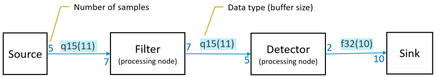 - A processing node (Detector) consuming 5 values with data type