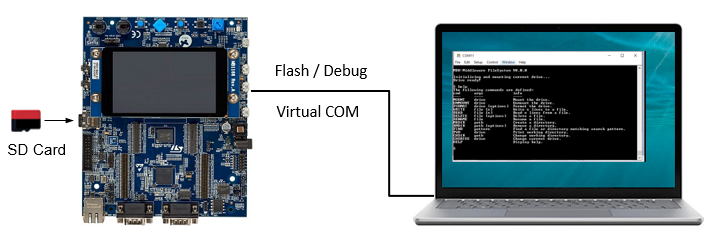 Typically one connects the development board to a computer via debug connection that also provides virtual COM port, downloads example application to a board and starts terminal application on computer.