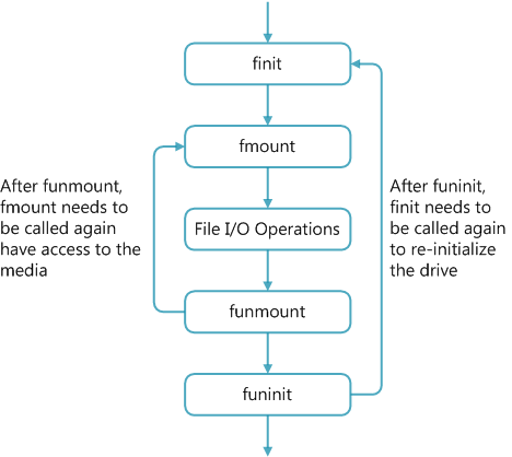 The function finit initializes the software library resources required for a certain drive, including the File System and the related driver. It must be called before invoking any other function accessing the file system of the drive. Calling finit does not access the actual media on the specified drive. Before working with the drive's media, a call to fmount is required. fmount checks if the media is present and formatted. finit fails if the File System Component in general or the driver cannot be initialized.