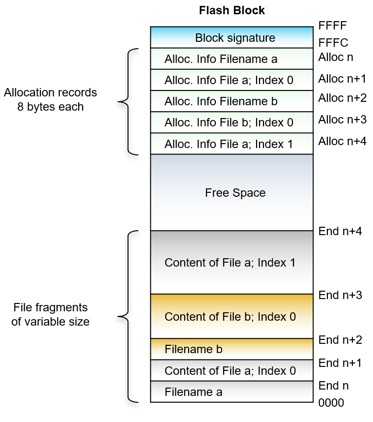 The file names & content region is located at the bottom of a block and is fully defined through the file allocation information records. It consists of file names and file content, which can both be fragmented. The first file fragment always starts at the beginning of a block (at offset 0) and is written in ascending order.