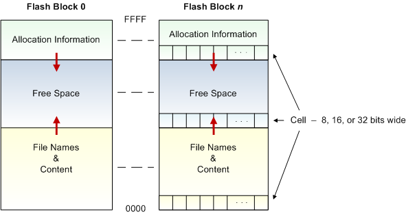 A NOR flash device memory array is physically divided into sectors or blocks. The File System Component designates them as blocks. Typically, a block's size is 64 kB which is also the smallest erasable unit. Blocks can be further divided, down to memory cells. The memory cell size depends on the device architecture and is 8- (byte), 16- (half word) or 32-bit wide (word). The memory cell architecture also defines smallest programmable unit, which must be maximum 32-bit for use with the Embedded File System.
