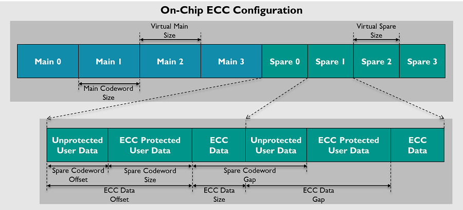 Amount of protected data is defined by codeword size, which is typically 512 bytes in main area and of various sizes in spare. Spare codeword may also not be aligned to start of spare area, but is located in spare with some offset. Spare codewords may also follow each other in arbitrary order, therefore codeword gap defines the gap between each codeword. It is similar with generated ECC data - its size, offset from start of spare and gap between each other may be arbitrary.