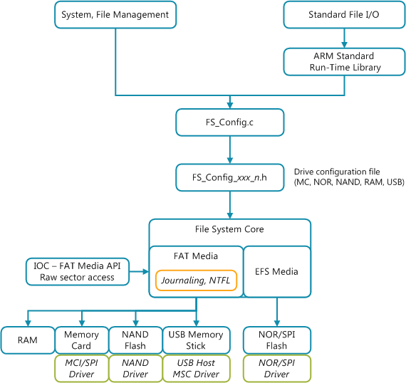 The File System Component supports a proprietary journaling mechanism for FAT which makes file I/O functions robust against system crashes or power failures. When FAT Journaling is enabled, the file allocation table and directory entries are protected.