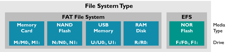 The File System Component supports various memory and storage devices that are assigned to a drive.