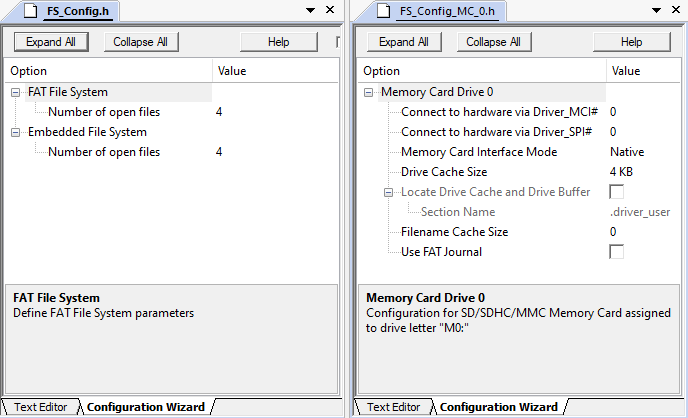In addition, you need to set drive specific settings in the FS_Config_Drive_0.h file, such as page and block sizes for Flash memories, general disk sizes for a RAM drive, and the hardware driver number for connecting the drive to the appropriate hardware peripheral driver.
