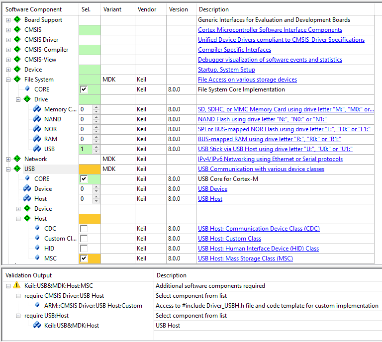 Using the CMSIS Component Manager window, you need to select the required software components for your application. The Validation Output helps you to identify dependencies to other software components and resolves them automatically, whenever possible.