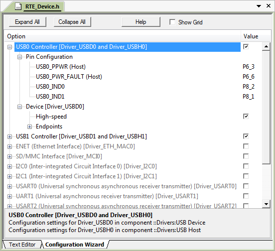 Usually, the device driver related to a software component and the associated controller in the microcontroller need to be configured as well. For the middleware, this is usually done in the file RTE_Device.h. Here, you can enable or disable the different hardware controllers and you can specify which device pins are used for the different features of a specific device peripheral.