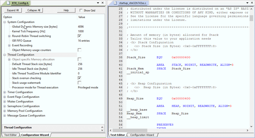 Every software component has resource requirements for stack, heap, and memory. Configuration files such as startup_device.s and file need to be adapted to these requirements. Every middleware component has a section that explains the resource requirements and gives examples on how to calculate the resulting values for adaption of the configuration files. The section Stack, Heap and RTOS Configuration gives you more information about the background and the configuration files that need to be touched.