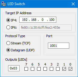 Type in the IP address of your development board (IPv4 and IPv6 addresses are accepted). When connected, you can control the on-board LEDs.
