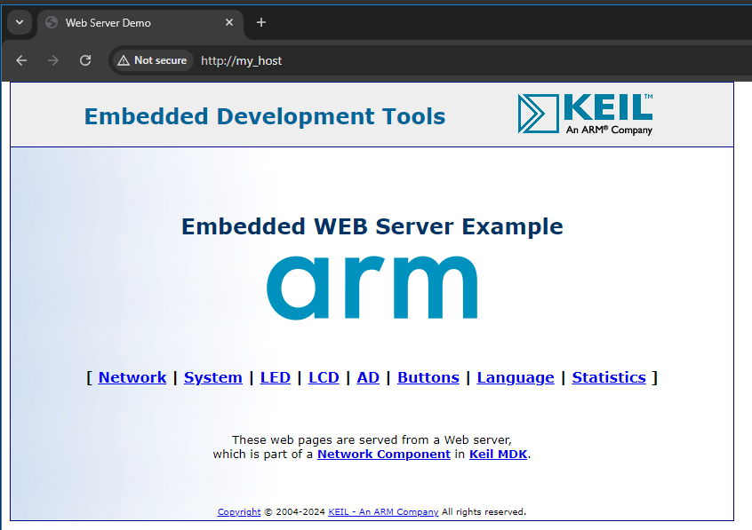 The example uses a fixed set of web pages stored in ROM, but is capable of exchanging information with the underlying hardware by using the CGI interface.