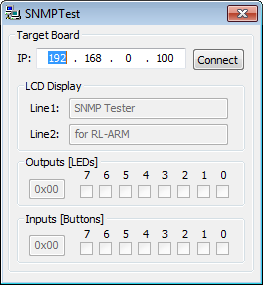 Type in the IP address of your Embedded SNMP Agent and click Connect. When connected, you can change the LCD text on the target, control the on-board LED diodes and monitor the state of on-board push-buttons.