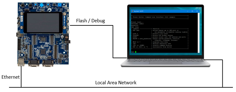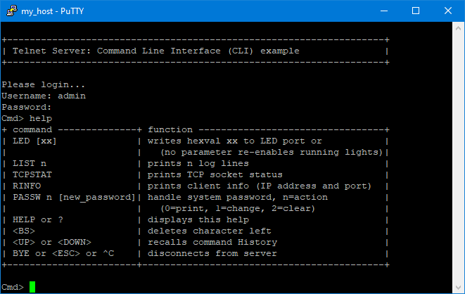 This example shows how the Telnet server can be used to implement a Command Line Interface (CLI) to interact with the device.