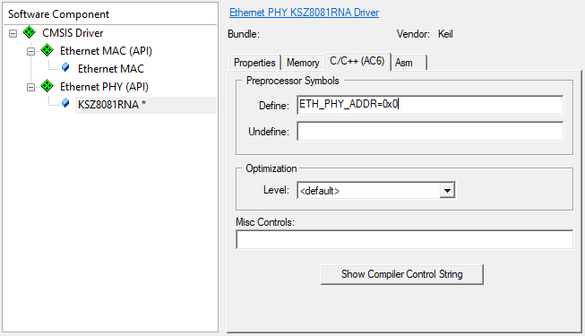 in the PHY driver needs to be changed accordingly to be able to control the PHY and to communicate with it. In µVision use the Options for Component dialog to override the default setting for ETH_PHY_ADDR
