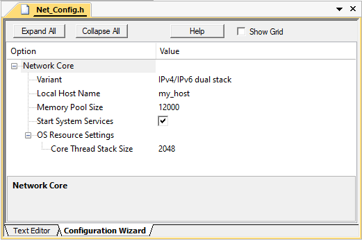 To change the default OS resource settings for the Network Core, use Core Thread Stack Size. The default value is 2048 bytes. The default Core Thread priority is osPriorityNormal. You can change this priority by changing the NET_THREAD_PRIORITY