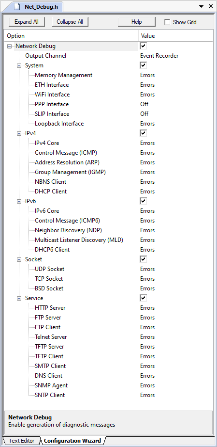 Network supports event annotations for the and makes it very easy to analyze the internal operation of the Network Component during application debugging. The old STDIO debug, which outputs event information as ASCII messages on the standard output device, is also supported.