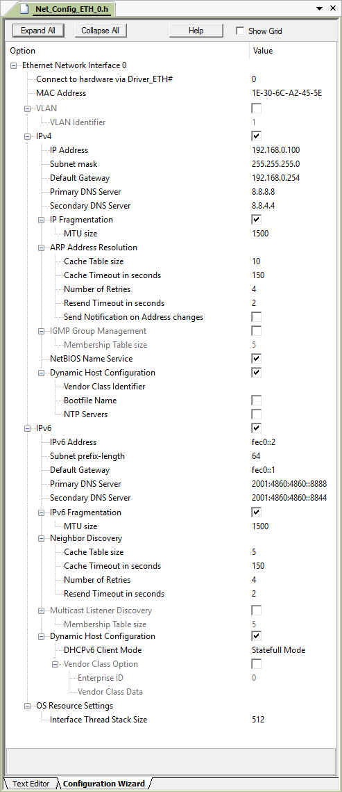 The Ethernet interface is configured using the Net_Config_ETH_n.h file. n stands for the number of the Ethernet interface. In general, most microcontrollers will have one Ethernet interface, thus the configuration file will be Net_Config_ETH_0.h. The options are set in the file directly or using the Configuration Wizard.