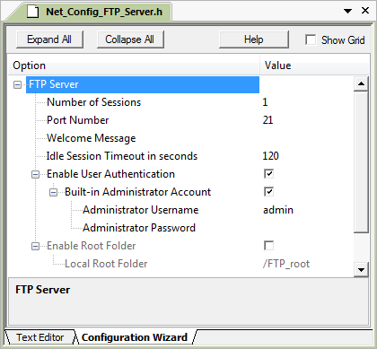 The FTP server configuration file Net_Config_FTP_Server.h contains the following settings: