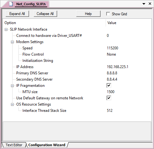 The SLIP interface is configured using the Net_Config_SLIP.h file.The options are set in the file directly or using the Configuration Wizard.