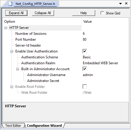 The HTTP server configuration file Net_Config_HTTP_Server.h contains the following settings: