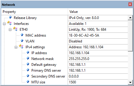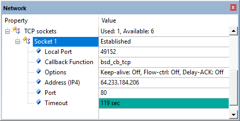 shows you static information about the operation of a software component. In the µVision debugger, go to Debug -> View -> Watch windows -> Network to see the status information of the network library: