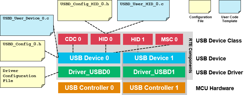 Multiple RTE Component instances can interface with more than one USB Controller or can implement multiple USB Device Classes. RTE Component instances are numbered. The number is appended to the RTE Component name, related configuration files, and user code templates. Each RTE Component has a separate configuration file. For example, for HID 0 and HID 1 the configuration files have the name USB_Config_HID_0.h