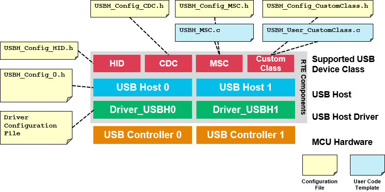 The following picture shows the relationships of the RTE Components with the microcontroller's USB Host peripheral (USB Controller). RTE Components provide configuration files and user code templates.