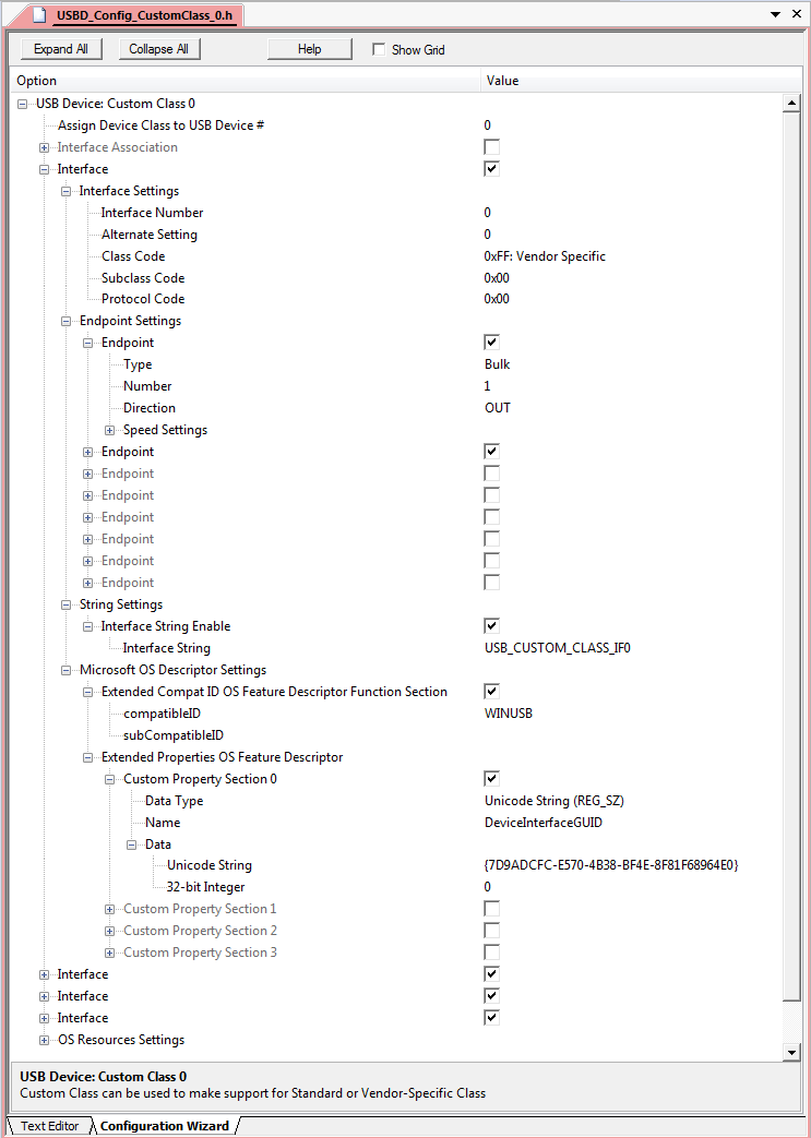 The USB Device Custom Class configuration file USBD_Config_CustomClass_n.h contains the following settings: