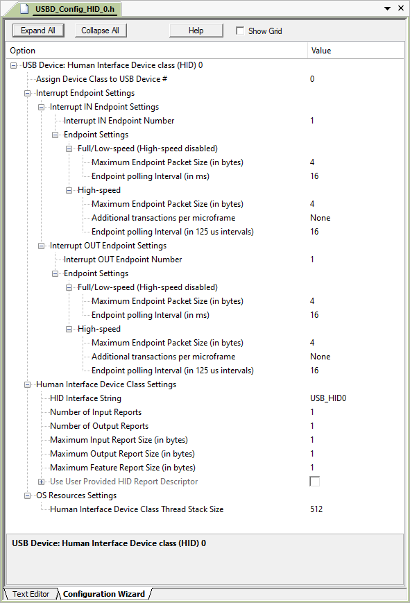 The USB Device HID Class configuration file USBD_Config_HID_n.h contains the following settings: