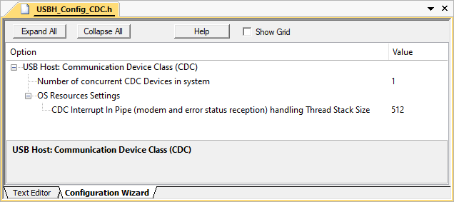 The USB Host CDC Class configuration file USBH_Config_CDC.h contains the following settings: