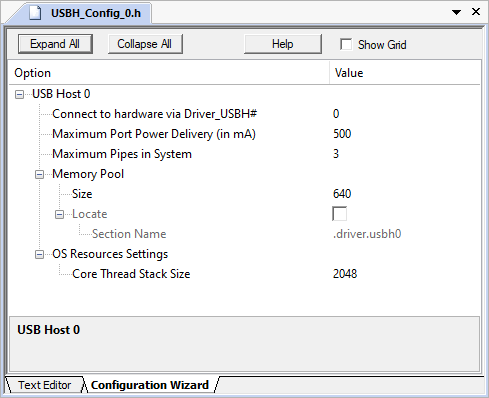 - Section Name specifies the section name for the USB memory pool that is used by the linker script to position it in memory. Default section name is