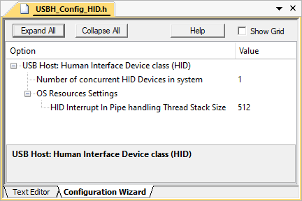The USB Host HID Class configuration file USBH_Config_HID.h contains the following settings: