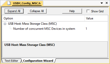 The USB Host MSC Class configuration file USBH_Config_MSC.h contains the following settings: