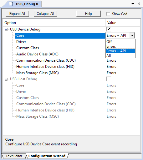 to your project. Use this file to set the event generation configuration for USB core, drivers, and device classes separately. The file is common for USB Device and Host components.