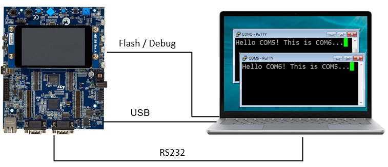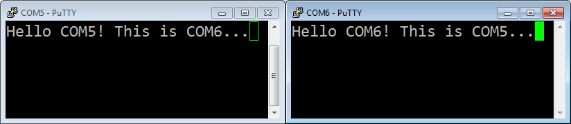 The USB Device Virtual COM example can be tested using a terminal emulation program. Please download an appropriate program for this purpose (such as PuTTY for example). Open the two COM ports "COMx" and "COMy". Any data from "COMx" will be echoed on "COMy" and visa versa:
