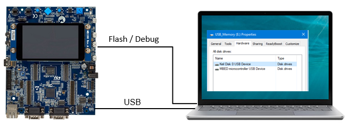 The following picture shows an exemplary connection of the development board and the USB Host Computer.