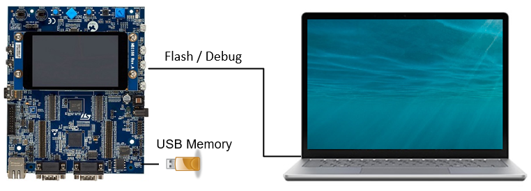 The following picture shows an exemplary connection of the development board and a USB memory stick.